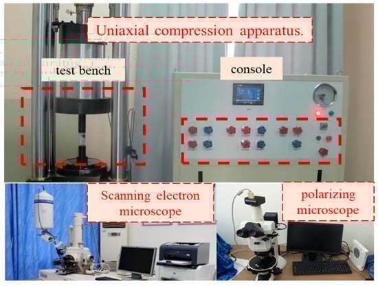 Uniaxial compression apparatus and scanning electron microscope.( Polarizing microscope Nikon LV100POL was used for polarizing microscope. Scanning electron microscope model is Quanta250 FEG. The rock mechanics test uses the YSJ-01-00 rock triaxial creep testing machine independently developed by the National Key Laboratory of Geological Disaster Prevention and Geological Environment Protection of Chengdu University of Technology.)