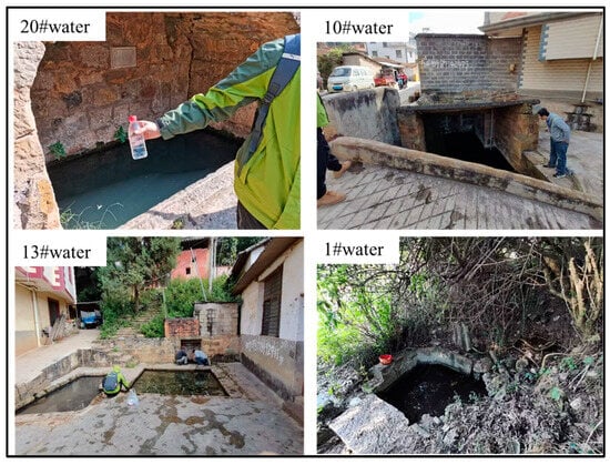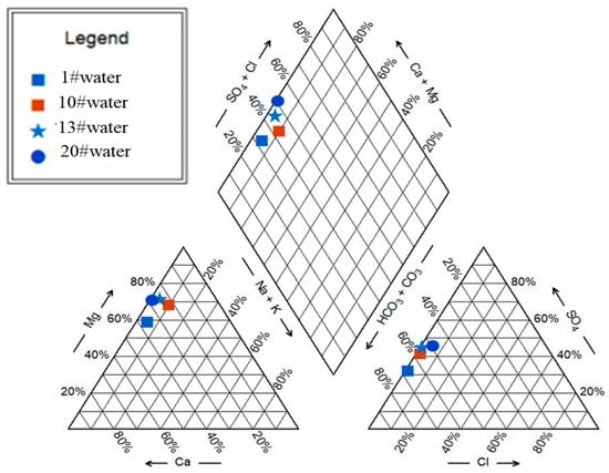 Numerous springs were present in the study area, and springs found throughout the upper, middle, and lower sections of the tunnel were investigated. Four characteristic spring water samples were collected nearby this area for water quality analysis (Figure 3). AquaChem was used to draw a three-line Piper diagram (Figure 4) to determine the quality of the water in this location. The Piper trilinear diagram comprises three parts. The triangles on the lower left and lower right represent the relative molar percentages of cations and anions, respectively. The intersection obtained by extending the diamond upwards represents the relative content of anions and cations in the water sample.