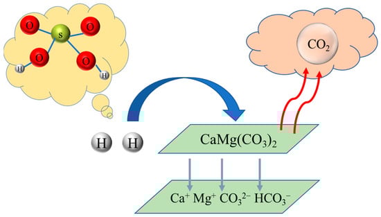 where is the mass of the CaMg(CO3)2 consumed during the reaction and is the initial volume of acid solution. According to Equations (10) and (11), when the pH and volume of the solution are known, the mass of CaMg(CO3)2 molecules can be consumed.