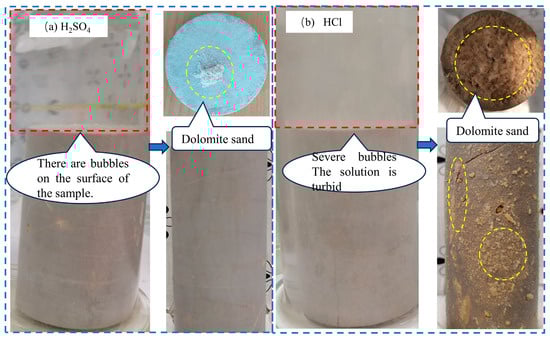 The CaSO4 produced by the sulfuric acid group is slightly dissolved and attached to the surface of the rock sample, which hinders the reaction. CaCl2 produced under the condition of hydrochloric acid is soluble in water, and the reaction is less affected. However, due to the strong reaction, some products are still attached. Under the condition of hydrochloric acid, the dissolution is more intense, the surface fracture pores are very developed, some particles are attached and detached, and the roughness is obviously improved. The severity of the two groups of tests and the type of dolomite sand are shown in Figure 6.