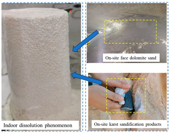 The structure of the rock is prone to transform into sand grains of varying sizes upon strong erosion of the dolomite, which are of low strength and can be scattered into sand by manually pinching. This type of karst geological phenomenon is known as dolomitic karst sanding [1]. Karst sanding of dolomite reduces the strength and quality of the rock mass, and forms unfavorable geological boundaries by significantly affecting the stability of slopes and underground chambers. Therefore, exploring the mechanism of dolomite sandification and establishing a model of the damage for rocks under hydrochemical action is theoretically significant [2,3,4]. Tang et al. [5] proposed the concept of chemical damage and analyzed its mechanism in rock water. They applied the theory of chemical composition analysis, energy viewpoint, and the damage mechanics method to analyze the quantitative method. Wang et al. [6] found that the ionic composition and pH value greatly affect the mechanical properties of red sandstone while using indoor tests. The peak strength, residual strength, and elastic modulus of the rocks decreased by different degrees after dissolution in various chemical solutions. Tang et al. [7] reported the deformation mechanism of rock salt dissolution characteristics under different circumferential pressures through numerous triaxial tests. Wei et al. [8] simulated the effect of aqueous solutions with different pH values on limestone dissolution and established a time-scale relationship between these solutions. Selective dissolutions exist in the composition and mineralogical composition of the rocks. Tian et al. [9] analyzed the dissolution difference between various carbonates based on a dissolution test of combined with scanning electron microscopy. In the theoretical context of chemical kinetics, Li et al. [10] discussed the chemical reactions between sandstone samples and acidic solutions at different curing temperatures and pressures, as well as their damage mechanisms. Liu et al. [11] discussed the chemical damage mechanism of dolomite from macroscopic and microscopic perspectives using indoor dissolution tests.
