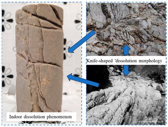 The indoor dissolution phenomenon of the rock samples in the sulfuric acid group is compared with the field (Figure 7). The tunnel face is mostly white after weathering, and the generated karst products correspond to the white attachments on the surface of the rock samples in the indoor sulfuric acid group test. After dissolution, the rock samples of the hydrochloric acid group produced multiple crisscrossed cracks on the surface, such as ‘knife-cut’ cracks. The ‘knife-cut’ corrosion morphology produced by the hydrochloric acid dissolution in the field can be seen (Figure 8).