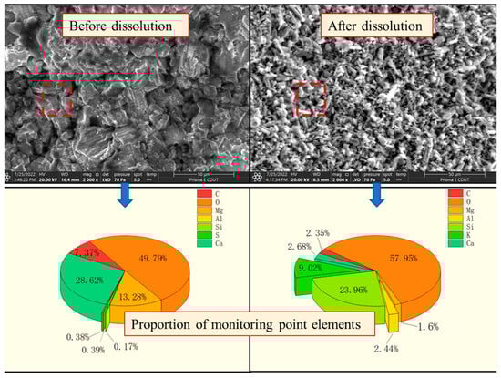 Sliced samples with different dissolution times were removed for scanning electron microscopy analysis. Combined with the macroscopic dissolution characteristics, dolomite was found to be mostly dissolved along the intercrystalline pores and crystal junctions. During the dissolution process, the crystals often fall off to form dolomite powder. However, dolomite powder formation was not observed for the majority of the samples. During the dissolution process, the clay minerals contained in the samples were wrapped in dolomite crystals on the surface or within, and the crystals were not easily separated from the parent rock. Macroscopically, the rock still possessed a complete structure; however, it remained adequately delicate to be crushed manually. Combined with the EDS (Electronic Differential System) analysis, the EDS of the same point in the scanning map showed that the content of oxygen was stable during the dissolution process, while the content of C was stable during the initial dissolution. As the dissolution time increased, the C content was reduced by 71%, and the content of Mg and Ca displayed a similar trend, which were reduced by 87.9% and 90.6%, respectively. The carbonate composed of these elements gradually dissolved during the dissolution process, while oxygen supplementation occurred during the replacement process; the overall content therefore remained stable (Figure 9).