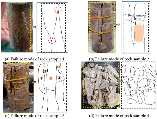 The uniaxial compression failure characteristics of the rock sample at pH = 1 are shown in Figure 10. Due to the strong acidity, the H+ penetration ability is strong and the penetration is deep. The failure characteristics are as follows: