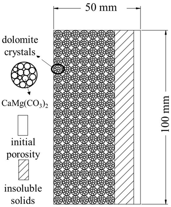 The dolomite in the study area was primarily of high purity (greater than 96%). The test samples were identified as fine-powder crystalline dolomite using thin sections. The particle sizes ranged from 0.02 to 0.04 mm. Combining the macroscopic dissolution characteristics of the mechanical specimens to establish a dolomite model composed of a spherical fine powder crystal dolomite crystal arrangement (Figure 11), the model was divided into three zones: the dissolution (dolomite), insoluble, and pore areas. The ratio of the dolomite crystal volume to the sample volume was greater than 10−10. Therefore, dolomite crystals were assumed to completely fill the dissolution zone.