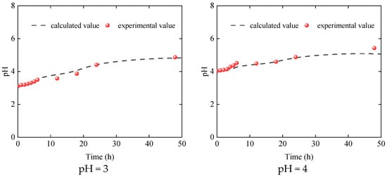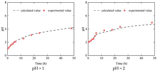 By simulating the change in different pH, the modeled data could accurately simulate the experimental data (Figure 12). The and parameters can be obtained according to the curve-fitting results of the relationship between the pH value and rock soaking time, which are 1.23 and 3.40, respectively.