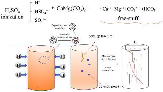 Diluted sulfuric acid was used as the acid solution. H+ ionized from dilute sulfuric acid reacted with the CaMg(CO3)2 molecules in the sample. The molecular structure was destroyed, the dolomite crystal structure was unstable, and pores developed. The connection between the pores produces microcracks. As the reaction proceeded, some microfractures were penetrated. When subjected to external forces, the fractures develop further in the dominant direction. The fractures developed further in the dominant direction. The indoor dissolution damage mode of dolomite is illustrated in Figure 13.
