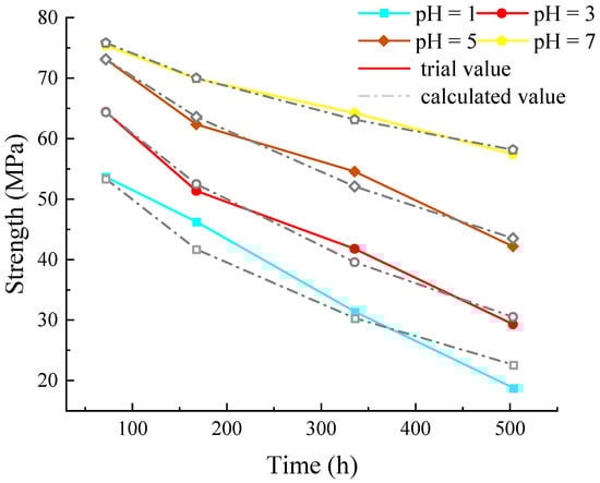 The dissolution amount of rock samples under different dissolution times can be obtained from the chemical reaction rate equation. The pore damage amount of rock samples can be obtained by substituting it into the damage model, and the chemical damage (Dc) can then be obtained. Finally, the strength predicted by the chemical damage model in this study was calculated, and the fit with the experimental value is shown in Figure 14.