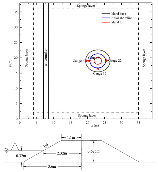 The numerical setup based on the experiments of Briggs for model validation is shown in Figure 1 (top view and side view). The numerical wave basin is 40 m wide and 40 m long. An idealized circular island is implemented, whose center is located at x = 23 m, y = 19 m. The slope of the island is 1:4, and the diameter at the base is 7.2 m. An incident solitary wave was generated by an internal wave-maker at x = 7 m. The initial values of surface elevation and velocity of the incident solitary wave were defined based on Wei and Kirby [45]. Sponge layers were arranged to absorb the reflected and radiated energy. The water depth of the basin is 0.32 m. In Briggs’s experiments, twenty-seven wave gauges were installed around the island to measure surface water elevations. Maximum run-up heights, Rmax, were measured visually at 20 shoreline locations around the perimeter of the island.