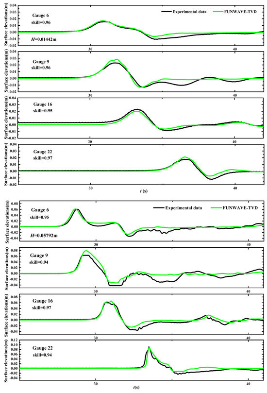 Two typical wave cases with incident solitary wave heights (H) of 0.01442 m and 0.05792 m were selected for model validation. Numerical simulations were performed with the grid size dx = dy = 0.05 m. Manning coefficient was set to 0.012 to characterize the surface roughness of smooth concrete used in Briggs’s experiments. Figure 2 shows the measured and computed results of time-varying surface water elevations at Gauge 6, Gauge 9, Gauge 16, and Gauge 22, whose locations are indicated in Figure 1. Figure 2 also shows the quantified model performance calculated by