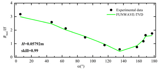 where Xmod is the computed value, Xexp is the measured value, and is the mean of measured values. As seen in Figure 2, the agreement between experimental data and numerical results is good overall. Model skills at four gauges of each case are around 0.95. Figure 3 shows the measured and computed non-dimensionalized maximum run-up heights around the island. The angle α is measured counterclockwise around the island from the incident wave direction, and comparisons at 12 locations are presented, while the other eight locations can be inferred from symmetry. It can be seen that for both cases, the model effectively reproduced the maximum run-up heights around the island, including the enhanced run-up heights on the lee side of the island caused by the collision of the trapped waves [32]. Model skills at four gauges of both cases are 0.99. The validation results presented in this section are similar to results obtained from the previous version of FUNWAVE presented by Chen et al. [46]. However, for the solitary wave case with H = 0.05792 m, Chen’s model obviously overestimates the leading wave height at Gauge 22, while the present model predicts the surface water fluctuations at Gauge 22 better. Correspondingly, the present model also predicts the run-up heights around the island more accurately. This may somehow reveal the advantages of the present model in predicting 2DH wave processes.