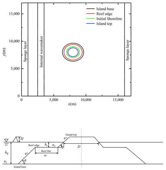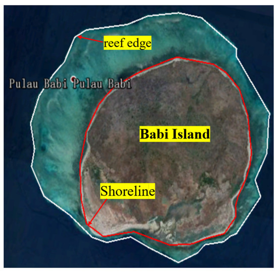 After validation of the present model, we first designed an idealized circular reef-fringed island based on an actual coral reef island in the numerical basin and investigated the typical propagation process of solitary waves. The numerical setup is shown in Figure 4. As shown in Figure 4, the numerical basin measures 16 km in length and 16 km in width, with the center of the reef-fringed island located at x = 8 km, y = 8 km. The internal wave maker was implemented at x = 3 km. The size of the reef-fringed island, such as the diameter of the initial shoreline circle and the reef edge circle, was determined based on the prototype, Babi Island (Figure 5), a typical coral reef island in Indonesia. Briggs’s physical model [2], the circular island, was also designed based on its mathematical simplicity and realistic geometry of Babi Island, but without considering fringing reefs. Using Google Earth, we measured the length of the shoreline of Babi Island (the inner red line in Figure 5), and it is about 6400 m. Taking this length as the circumference of the initial shoreline circular in Figure 4, the diameter of the initial shoreline circle Di is 2016 m. Similarly, we measured the length along the reef edge (the outer white line in Figure 5), which is about 9000 m, and the corresponding diameter of the reef edge circle in Figure 4 is 2816 m. Moreover, the back-reef slope (cot β) was set to be 4, the same as the slope of Briggs’s circular island. The reef flat’s water depth (hr) and fore-reef slope (cot θ) were set to be 3 m and 4, falling within the common ranges of these parameters as reported by Quataert et al. [47]. Then the reef flat (w) is about 400 m, which also falls within the range of reef flat widths reported by Quataert et al. [47]. Table 1 summarizes the conditions of numerical experiments in this section. As seen in Table 1, the incident wave height (H) and deep water depth (hd) were set to be 2 m and 60.5 m, in which case the height-to-depth ratio (ε = H/hd = 0.033), measuring the nonlinearity of incident solitary wave, is within the range of experiments of Briggs. As suggested by previous studies [20,37], the Manning coefficient of fore-reef slop and reef flat (n2) was set to be 0.09 for healthy and prosperous coral reefs, while the Manning coefficient for the back-reef slope (n3) and basin bottom(n1) were set to be 0.04 (cobbles) and 0.02 (sand), respectively. Moreover, based on the above conditions of case 1, we also set case 1A just without fringing reefs for comparison. The total simulation time is 450 s and the time interval for data output is 1 s for both case 1 and case 1A.