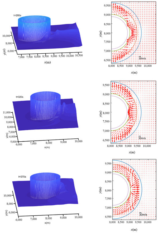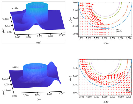Figure 6 shows the typical snapshots of free-surface profiles and corresponding velocity fields at different times for case 1. As seen in Figure 6, when t = 150 s, the incident solitary wave has reached the front of the island (in the following content of this article, “island” means the land portion inside the shoreline). Large onshore velocity and run-up can be observed along the front of the island, with a portion of the solitary wave starting to diffract on both sides of the island. When t = 225 s, diffracted waves on both sides have reached the middle part of the island. Because of the very shallow water depth over the reef flat, the wave celerity over the reef flat is much slower than that outside the reef flat, so the diffracted waves on both sides seem to separate into two parts. However, the velocity over the reef flat is much greater than outside it. When t = 295 s, the diffracted waves outside the reef flat are trapped by the reef-fringed island and collide at the lee side of it, generating large onshore velocity. Then, the diffracted waves over the reef flat also collide (t = 320 s) on the lee side, and these two collisions of diffracted waves finally lead to the run-up at the back of the island (t = 375 s). The propagation process around the reef-fringed island revealed in Figure 6 is somehow different from the one around the island without reefs. As revealed by Liu et al. [32], diffracted waves around the island without reefs do not separate, and the corresponding run-up at the back of the island is generated only by one collision of trapped waves.