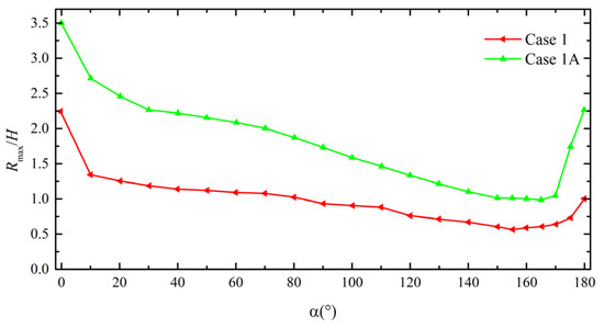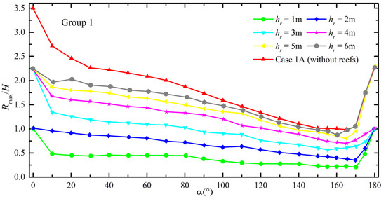 Figure 7 compares the numerical results of dimensionless maximum run-up heights around the island for case 1 and case 1A. As seen in Figure 7, the maximum run-up heights along the island are reduced with the presence of reefs, including the run-up enhancement on the lee side of the island. The maximum run-up height can be reduced by 36% at α = 0°, 47% at α = 90°, and 56% at α = 180°, in which α means the angle measured from the point of direct tsunami impact. The results of Figure 6 and Figure 7 clearly reveal the typical solitary wave propagation process around a reef-fringed island and the basic role of coral reefs in mitigating tsunami hazards around an isolated island.