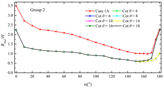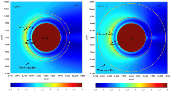Figure 9 illustrates calculated non-dimensionalized maximum run-up heights around the reef-fringed island with different for-reef slopes for Group 2. The distribution of non-dimensionalized maximum run-up heights around the conical island without fringing reefs (case 1A) is also presented for comparison. As shown in Figure 9, in general, the fore-reef slope has little impact on solitary wave maximum run-up heights around the reef-fringed island. This phenomenon is similar to what was reported in the previous 1DH studies [28], which demonstrated that over two-dimensional fringing reef bathymetries, the solitary wave run-up height is insensitive to the change of the fore-reef slope. Ning et al. [28] demonstrate that although a gentler fore-reef slope results in a reduced reflection, it also changes the position of the breaking point, causing the solitary wave to break earlier and consume more energy. Moreover, for this study, it should be noted that when Cot θ is larger than 14, the maximum run-up heights on the lee side of the reef-fringed island are very close to the ones of case 1A. Figure 10 further demonstrates the calculated maximum surface elevations around the island when Cot θ = 4 and Cot θ = 16. As seen in Figure 10, the impact range on wave propagation of reef-fringed islands with Cot θ = 16 is much larger than the one of reef-fringed islands with Cot θ = 4. Maximum surface elevations on the lee side of the reef-fringed island with Cot θ = 16 generated by two collisions of trapped waves outside and on the reef flat are also larger than the ones on the lee side of the reef-fringed island with Cot θ = 4. Based on these results, we think that when the fore-reef slope gets mild to a certain extent, a larger body of water will be trapped by the reef-fringed islands, resulting in collisions on the lee side and finally increasing the run-up heights around the back of the island.