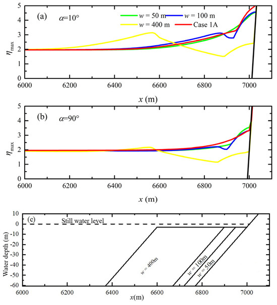 The calculated cross-shore distributions of the maximum surface elevation at the positions of (a) α = 10° and (b) α = 90° over (c) reef profiles when the reef flat width is 50 m, 100 m, and 400 m.