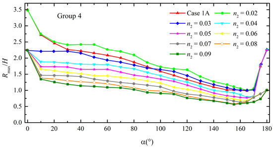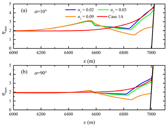 Figure 13 illustrates the calculated non-dimensionalized maximum run-up height distribution around the reef-fringed island with different reef surface roughness for Group 4. The distribution of non-dimensionalized maximum run-up height around the conical island without fringing reefs (case 1A) is also presented for comparison. As seen in Figure 13, the maximum run-up heights around the reef-fringed island increase with a decrease in reef roughness. Similar to the effect of reef flat water depth, when n2 reduces to 0.05, the enhanced run-up heights on the lee side are almost the same as those without coral reefs. Moreover, similar to the effect of reef flat width, when the surface roughness of coral reefs decreases to 0.03 and 0.02, the maximum run-up heights around the reef-fringed island are even higher than those without coral reefs. Figure 14 further illustrates calculated cross-shore distributions of the maximum surface elevation at the positions of α = 10° and α = 90° when the reef surface roughness is 0.02, 0.03, and 0.09. As seen in Figure 14, when coral reefs are healthy and prosperous (i.e., n2 = 0.09), before increasing in front of the back-reef slope due to the shoaling effect, the maximum surface elevation can undergo enough attenuation after solitary wave propagates onto the reef flat, resulting in a final run-up height still lower than the one without coral reefs. However, for the cases of n2 = 0.03 and n2 = 0.02, the maximum surface elevations over the reef flat do not exhibit significant attenuation before rising due to the shoaling effect of back-reef slope, resulting in final run-up heights close to or even larger than the one without coral reefs. These results indicate that when the surface roughness of coral reefs is small to a certain extent, coral reefs will first lose their protective capability on the lee side, and when the roughness of coral reefs is small enough, the presence of coral reefs may even enhance tsunami hazards around an island. Since the above-average seawater temperatures caused by global warming are the leading cause of coral bleaching [50], it is believed that climate change will not only reduce the defensive effect of coral reefs against tsunami hazards but also exacerbate the degree of tsunami disasters around the island.