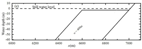 The parameterized numerical experimental conditions are shown in Table 2. As seen in Table 2, by changing only one parameter in each group, four groups were designed to investigate the effects of these parameters independently. Values of unchanged parameters in all groups are the same as the ones in case 1. The varying ranges of hr, Cot θ, and w in Group 1, Group 2, and Group 3 were set based on the reef parameter ranges reported by Quataert et al. [47]. We have to mention that Quataert et al. [47] report that the reef flat’s water depth is usually less than 4m, and the previous research [48,49] also indicated the potential for a 2-meter rise in sea level by the year 2100. Hence, the maximum value of hr in Table 2 was established as 6 m to account for the effect of sea-level rise. The varying range of n2 in Group 4 was set based on Gelfenbaum et al. [37], who suggest the Manning coefficient of 0.02 can represent the smooth surface roughness of dead coral reefs.