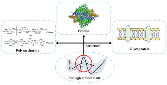 Based on their chemical composition and structure, MBFs can be broadly classified into three major categories: polysaccharides, proteins, and glycoproteins [], as shown in Figure 1. Polysaccharide MBFs are the most common and extensively studied type of MBFs []. They are composed of repeating monosaccharide units (e.g., glucose, galactose, mannose) connected by glycosidic bonds, forming linear or branched polymers with high molecular weights (104–107 Da) []. Polysaccharide MBFs often contain functional groups (e.g., hydroxyl, carboxyl, amino, sulfate) that can interact with pollutants through hydrogen bonding, electrostatic attraction, and complexation mechanisms. Some examples of polysaccharide MBFs include xanthan, dextran, pullulan, and alginate-like exopolysaccharides. Protein MBFs are another important category of MBFs, which are composed of polypeptide chains with a high content of acidic (e.g., aspartic acid, glutamic acid) and hydrophobic (e.g., alanine, valine) amino acids. Protein MBFs usually have lower molecular weights (103–105 Da) than polysaccharide MBFs but exhibit higher charge density and flocculating activity. The flocculation mechanism of protein MBFs involves charge neutralization and bridging effects between the positively charged amino groups and negatively charged particles. Glycoprotein MBFs are a special type of MBF that contain both polysaccharide and protein moieties covalently linked together []. The polysaccharide component provides the backbone structure and hydrogen bonding sites, while the protein component confers the charge and hydrophobic interactions. Glycoprotein MBFs often have a complex and heterogeneous structure, with a molecular weight ranging from 105 to 107 Da. The synergistic effect of polysaccharide and protein components can enhance the flocculation performance and stability of glycoprotein MBFs.