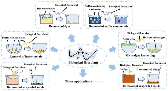 As shown in Figure 4, a microbial flocculant (MBF) exhibits environmentally friendly characteristics, biodegradability, superior efficiency, and selectivity, and shows promise in various applications such as the removal of suspended solids (SSs) and the treatment of heavy metal wastewater, dye wastewater, and sulfur-containing wastewater. Additionally, it can be used for microalgae harvesting, microplastic removal, and bacteria inhibition, making it highly attractive.