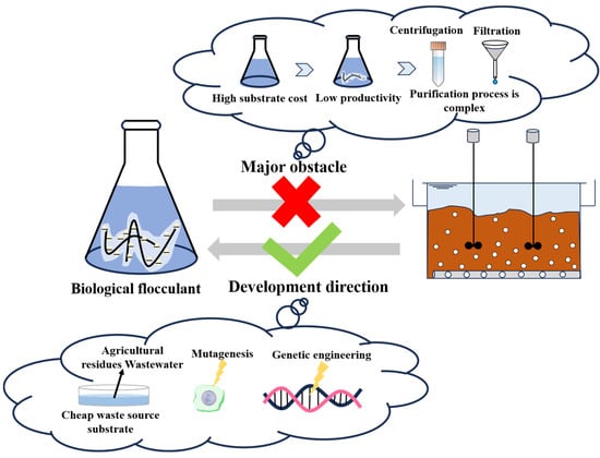 Although MBFs offer numerous attractive advantages and hold significant promise for application, they still face several obstacles that impede their large-scale production and use. Major hurdles include high manufacturing costs, low yield, complex compositions, and the uncertain safety of MBF products []. To address these challenges and facilitate the industrial application of MBFs, considerable research has been directed towards identifying high-producing strains, optimizing fermentation processes, sourcing low-cost substrates, and enhancing downstream processing methods []. With the advancement of wastewater treatment technology, the benefits and potential of biological flocculants in wastewater treatment are increasingly evident. Furthermore, as science and technology progress, we have access to more advanced technologies for further developing the principles and applications of biological flocculants.