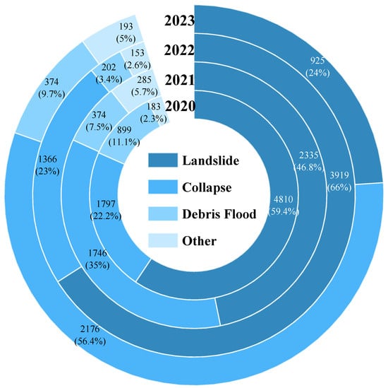 With the frequent human activities and the increasing scale of construction projects, urbanization has accelerated globally, especially in China [1]. This rapid urbanization has led to an increase in extreme weather events and has posed greater challenges and costs in managing these events due to the higher population density in cities [2,3,4]. Among these extreme weather events, irregular heavy rainfall has become increasingly threatening and destructive [5,6]. In 2023, China experienced a total of 37 heavy rainfall processes, with a cumulative surface rainfall of 240 mm. According to the statistical yearbook of the Ministry of Emergency Management [7], there were 3666 geological disasters in China in 2023, with landslides being the most prevalent (Figure 1). For instance, in July 2023, a rainstorm in Chongqing led to a series of geological disasters resulting in 25 deaths and disappearances. In August, a sudden landslide in Liangshan Prefecture, Sichuan Province, caused by short-term heavy rainfall resulted in 52 casualties.
