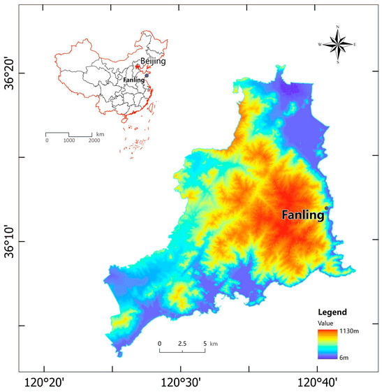 The Fanling landslide is in Laoshan District, Qingdao, Shandong Province, China (Figure 2). As of 2023, the permanent population is 513,700 and the gross domestic product is 115.089 billion yuan. The Fanling landslide is an ancient landslide, formed from loose accumulated layers during the Quaternary and modern periods. The front edge of the landslide is about 3–4 m away from the sea surface of the Yellow Sea. The sliding surface is located in fully weathered granite and is in a pushover-type broken line sliding failure mode. There have been two recorded landslide events in this area, occurring on 11 August 2007, and 23 July 2020, both of which were triggered by extreme rainfall.
