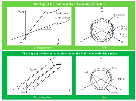 The traditional Mohr–Coulomb criterion often exhibits sharp corners on its yield surface, leading to challenges such as slow convergence in numerical calculations. To address this, the classical Mohr–Coulomb model is extended in this study using a continuous smooth flow potential function to describe the failure and deformation of slope soil (Figure 5) [25].