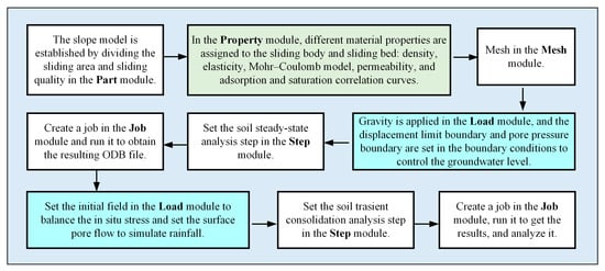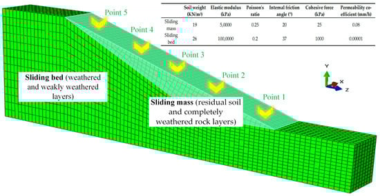Based on field data and previous research by Yu [23], the landslide model is simplified into two parts: a sliding body and sliding bed. The numerical model includes 12,494 grid units and 5 monitoring points, as depicted in Figure 6, with the modeling process outlined in Figure 7.
