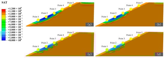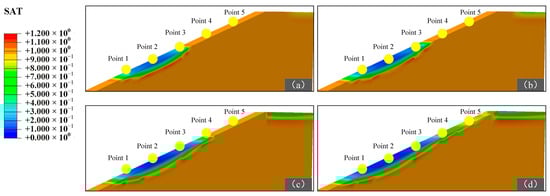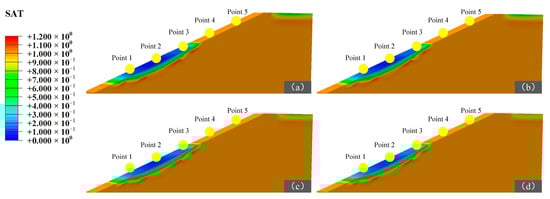 Numerical simulations were conducted with a fixed rainfall intensity amplitude and varying rainfall durations, as depicted in Figure 11 and Figure 12. Under a consistent amplitude of rainfall intensity, an increasing rainfall duration leads to notable shifts in the slope’s saturated area and the position of the infiltration surface. In the N5 scenario with a duration of 32 h, the groundwater infiltration surface reaches near the slope’s surface, resulting in a minimal unsaturated area in the middle and bottom sections. Conversely, N6 (24 h duration) shows a lower infiltration surface compared to N5, accompanied by an increase in unsaturated areas. In N7 (16 h duration), the infiltration surface further recedes compared to N5 and N6, reducing the unsaturated area. By N8 (8 h duration), the infiltration surface significantly diminishes compared to previous conditions, expanding the unsaturated zone towards the upper slope and forming a complete aeration zone. Upon conversion, reducing the duration from 32 h to 8 h decreases the extreme pore water pressure to 24.82 kPa, 22.07 kPa, 19.77 kPa, and 16.72 kPa, respectively.