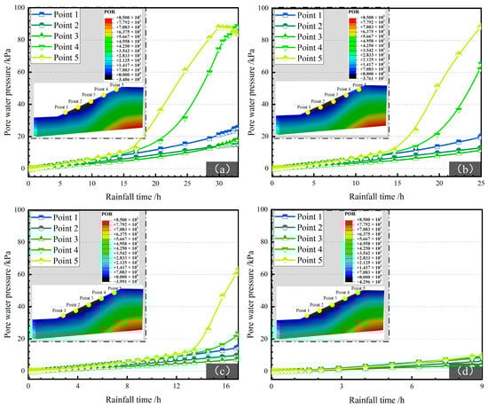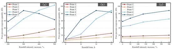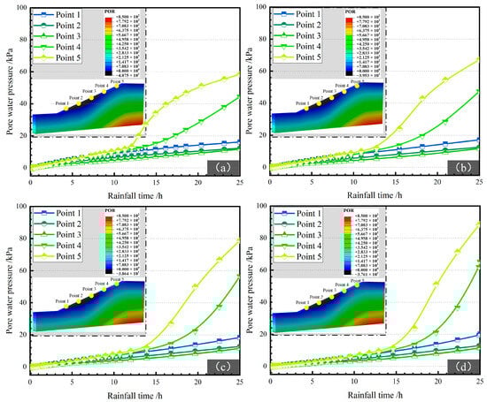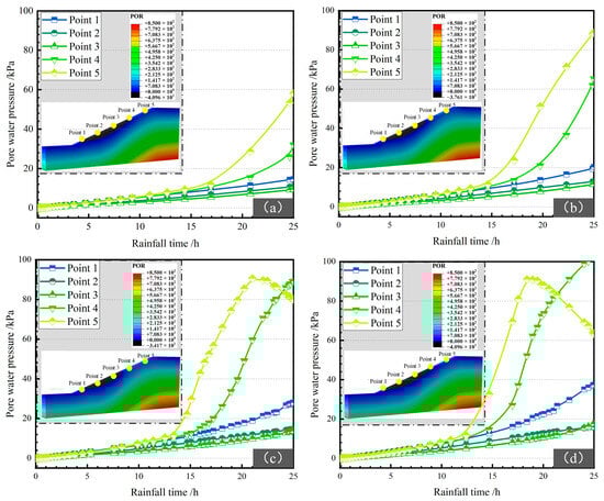 As the rainfall duration increases, the infiltration line within the slope rises, indicating increasing soil saturation over time. Pore water pressure values vary across different points, showing rapid increases in the upper part where the weathered layer is thin, causing the infiltration surface to rise swiftly. Significant variations in the pore water pressure amplitude and velocity at specific points correlate positively with the rainfall duration. Under N5 conditions, significant increases at points 4 and 5 occur after 16 h of rainfall, while N6 shows this phenomenon around 14 h. In N7, point 5 experiences significant changes after approximately 13 h of rainfall, while N8 shows no significant changes. Points 1, 2, and 3 exhibit a steady increase in pore pressure, indicating that the infiltration surface surpasses these points. These observations suggest that shorter rainfall durations accelerate changes in the rainfall intensity amplitude, resulting in earlier significant pore pressure changes at the monitoring points. However, the final pore pressure response correlates positively with the rainfall duration, despite the unchanged rainfall intensity amplitude.
