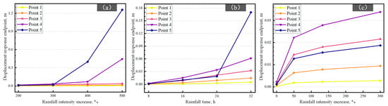 To elucidate the relationship between the seepage field response and landslide development, final pore water pressure values (Figure 15) and displacement response values (Figure 16) were extracted for a comprehensive analysis across each monitoring point.