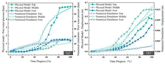 Physical model experiment–numerical simulation comparison. (a) Pore water pressure; (b) displacement.