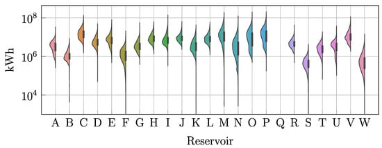 Time-series Violin plot depicting the streamflow contribution for each reservoir within the dataset.