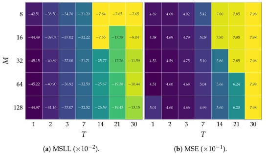 Grid search results for tuning the model order T and the number of inducing points M. Ten-fold average is reported for MSLL and MSE metrics. The yellow to blue transition indicates a change from worse to better hyperparameters.