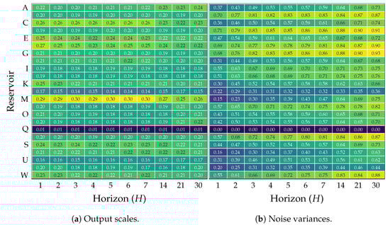 Regarding the noise variance, the heightened unpredictability in the output data at long horizons yields an increment in , which also supports the positive definiteness of the covariance matrix in Equation (4). For such horizons, the model uncertainty mainly depends on the noise variance rather than the output scale. Therefore, the SVGP model exploits the data correlations at short horizons, yielding a low uncertainty while understanding the lack of information for long-horizon forecasting as a zero-mean isotropic Gaussian posterior. Notice that the SVGP is capable of inferring null variance for reservoir Q due to zero streamflow.