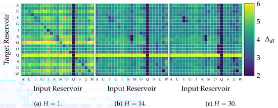 The lengthscale analysis relies on its capacity to deactivate nonessential features on a kernel machine according to the Automatic Relevance Determination (ARD) criterion [,]. Hence, a small lengthscale value implies a high relevance for predicting the future streamflow of a reservoir from the past of another []. Figure 5 depicts the trained lengthscales in Equation (17) from each input feature (columns) to each output task (rows) for prediction horizons of one day (left), two weeks (center), and one month (right). At first glance, reservoir Q exhibits notably small lengthscales, for predicting other reservoirs (Q-th column) and high lengthscales as the target reservoir (Q-th row), misinterpreted as highly relevant according to ARD. As the target reservoir, the zero streamflow during the observation period tunes high lengthscales values due to no relevant features being found. Hence, the SVGP turns off the corresponding rows in (in Equation (4)) and the influence of every reservoir on the posterior mean for the reservoir Q despite its lengthscale. As the predicting reservoir, Q holds N zero terms within the vector in Equation (4), yielding a zero contribution to build the mean posterior of every other reservoir. In either case, the SVGP identifies the influence lack of the reservoir Q and fixes the corresponding lengthscales (rows and columns) to the default value of .