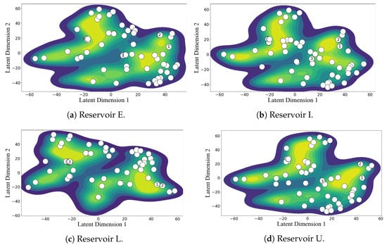 For visual interpretation of SVGP inner workings, Figure 6 maps in 2D the reservoir data along with the optimized inducing points using the t-distributed Stochastic Neighbor Embedding (t-SNE) technique for each target reservoir. The input-space similarity measure demanded by t-SNE was tailored to the kernel in Equation (17) with the tuned lengthscales for each task, guaranteeing the mapping of the same latent space designed by the SVGP. The filled contours outline the density distribution of training data, whereas the color scatter locates the optimized inducing points. We strategically labeled three inducing points for analyzing the SVGP behavior. Since the forecasting tasks share the inducing points, not the kernel parameters, each target reservoir holds a different t-SNE mapping.