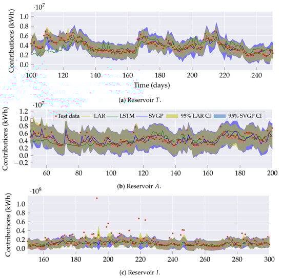 Figure 7 illustrates the testing time series of streamflow contributions and their corresponding one-day ahead predictions generated by the contrasted models for three reservoirs strategically chosen to show different forecasting complexities. The red dots correspond to test data and the green lines denote the LSTM predictions. The yellow and blue lines and regions represent the mean and 95% confidence intervals for the LAR and SVGP predictive distribution, respectively.