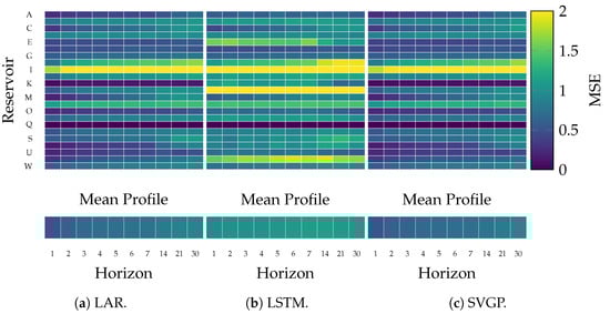 For performance analysis, the proposed SVGP-based forecasting is contrasted against the straightforward Linear AutoRegressive model (LAR) and the nonlinear Long-Short-Term Memory network (LSTM) [,,,,]. Particularly for LAR, we trained a single output model for each task. Further, the frequentist perspective treats the model weights as random estimators following a Gaussian distribution. Such a treatment turns the LAR into a probabilistic model, allowing it to generate confidence intervals for its predictions. In the case of LSTM, we set up a single multi-output model to forecast all reservoirs simultaneously. To tune the number of hidden units of the LSTM, we run a grid search, yielding an optimum of one unit. As a deterministic model, LSTM lacks a predictive distribution and cannot be assessed with the probabilistic performance metrics MSLL and CRPS.