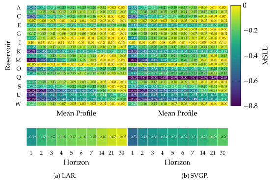 Achieved MSLL for LAR and SVGP forecasting models at each horizon and reservoir.