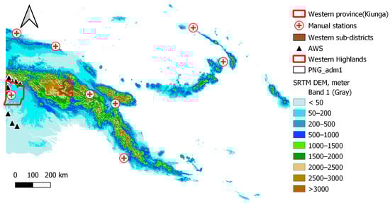However, despite the importance of climate data within the agricultural sector, there are very few meteorological stations in the Highlands (Figure 1). The regional topography, derived from Shuttle Radar Topography Mission (SRTM) data with a 30 m spatial resolution [27], is depicted alongside the existing operational observation network (Figure 1). Analysis of the impacts of historical droughts based on previous reports [7,8] and consultations with the NWS revealed that during past drought years the Western Province and Western Highlands Province were the most severely affected agricultural areas. Thus, we decided to initiate and develop a drought-triggering methodology for agricultural assistance in these two provinces (Figure 1).