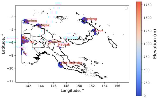The WMO noted that the representative area of a weather station may extend up to a radius of 100 km in ideal conditions, e.g., flat terrain with no large water bodies or extensive variations in vegetation [35]. Moreover, the different meteorological variables do not possess identical spatial representativeness [35]. For instance, rainfall, a discrete variable, exhibits greater spatial variability compared with temperature and pressure [36]. Thus, the representative radius for rainfall observations may be limited to 10–50 km within complex orographic terrain [37]. To analyze the representative area of the observation network in PNG, we examined a 50 km radius area using a digital elevation model from SRTM. We created a 50 km buffer zone and then, using elevation data and relief exposure, identified the coverage zone of the observations. Elevations above the station’s level and areas with rugged relief and exposure were excluded as non-representative zones.