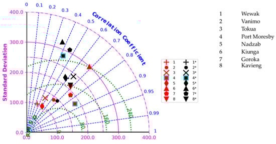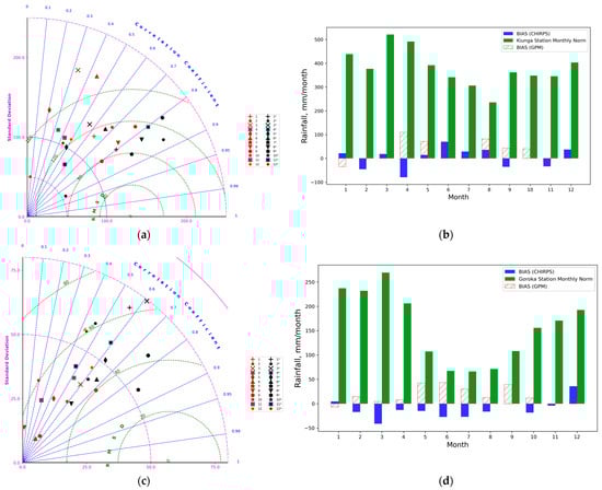 As noted, the current rainfall observation network is not sufficient to cover all of PNG, and RS data should be assimilated with in situ observations to fill the gaps. To verify the monthly rainfall data from CHIRPS and GPM, we calculated the standard deviation, root mean square difference, correlation coefficient, and bias for the eight long-term manual observation stations (Figure 2; stations labeled red). Taylor diagrams and bias graphs for Kiunga station (Figure 3a,b), one of the target areas of AA, and the Western Highlands Province (the second piloting area), using the closest station (Goroka; Figure 3c,d), are presented for the period of 2000–2023. For the other six stations, Taylor diagrams and bias graphs are presented in Appendix A.