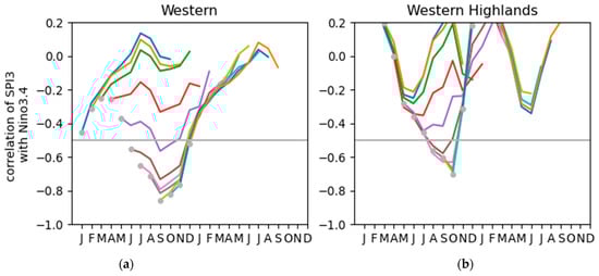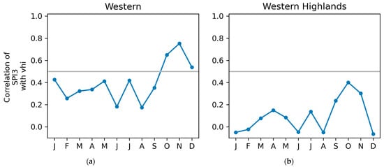 Correlations between VHI and SPI3 for the (a) Western Province and (b) Western Highlands; sample period: 1984–2022. Correlation levels indicate statistically significant correlations (+0.5), marked with a grey line.