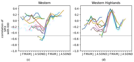 Correlations between IOD and SPI3 for (a) East Sepik, (b) West Sepik, (c) Central, (d) Chimbu, (e) New Ireland, (f) Manus, (g) Milne Bay, (h) Northern, (i) Gulf, (j) Southern Highlands, (k) Enga, (l) Madang, (m) Eastern Highlands, (n) Morobe, (o) East New Britain, (p) West New Britain, and (q) Northen Solomon at various lead times. The SPI3 for the nominal month represents data from three subsequent months (i.e., the data point for January will be the SPI3 from January to March). Each line represents a correlation between the IOD on the month marked by the marker, and the given month’s SPI3. The correlation level indicates the practically applicable predictive power (−0.5), marked with a grey line; the sample period is 1984–2022.