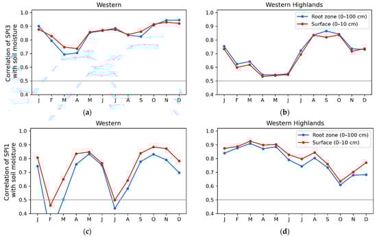 Correlations between soil moisture anomalies and SPI3 (a,b) and SPI1 (c,d). The Western Province’s data are shown in (a,c) and data for the Western Highlands Province are shown in (b,d). Correlation levels indicate statistically significant correlations (+0.5), marked with a grey line.