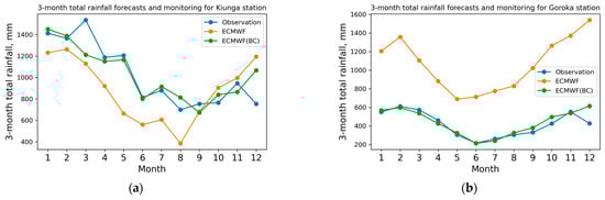 Trends of 3-month total rainfall forecasted by ECMWF (in orange), 3-month total rainfall bias-corrected ECMWF (BC) predictions (in green), and in situ observations from the meteorological stations (in blue) for 2023: (a) Kiunga meteorological station; (b) Goroka meteorological station.