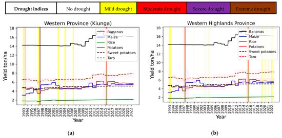 CDI and crop yield time series data (a) for the Western Province (Kiunga district) and (b) for the Western Highlands Province within the period 1993–2022. The colored vertical lines represent the severity of drought, as noted in the top of the figure.