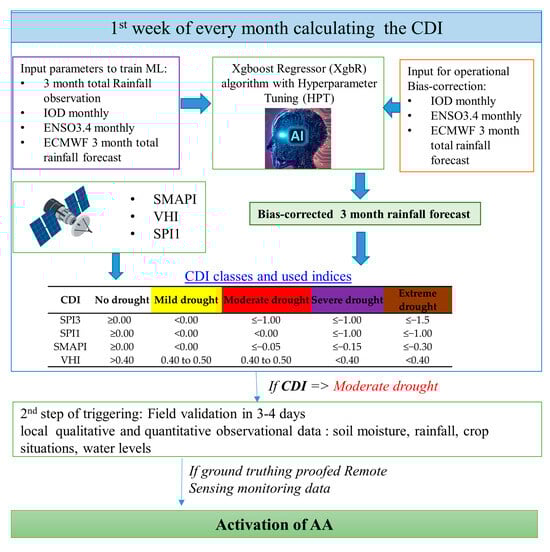 This approach not only monitors meteorological drought but also forecasts agricultural drought, encompassing processes spanning > 4 months, involving interactions between the atmosphere and the Earth’s surface. In its simplest form, the CDI enables us to determine which phase of the cause-and-effect relationship the agricultural system has entered during a drought event and when to initiate the activation of the anticipatory action (AA) protocol.
